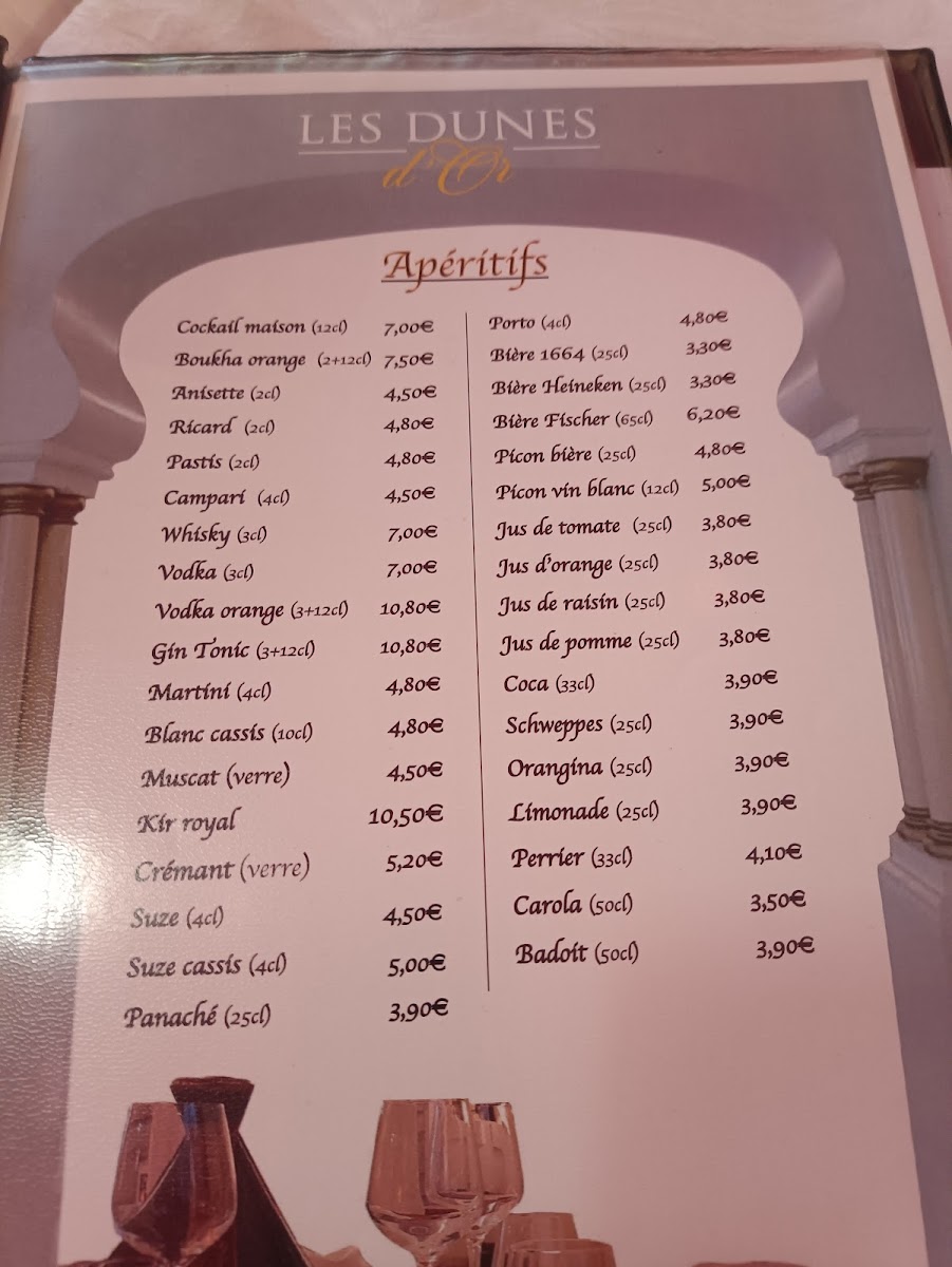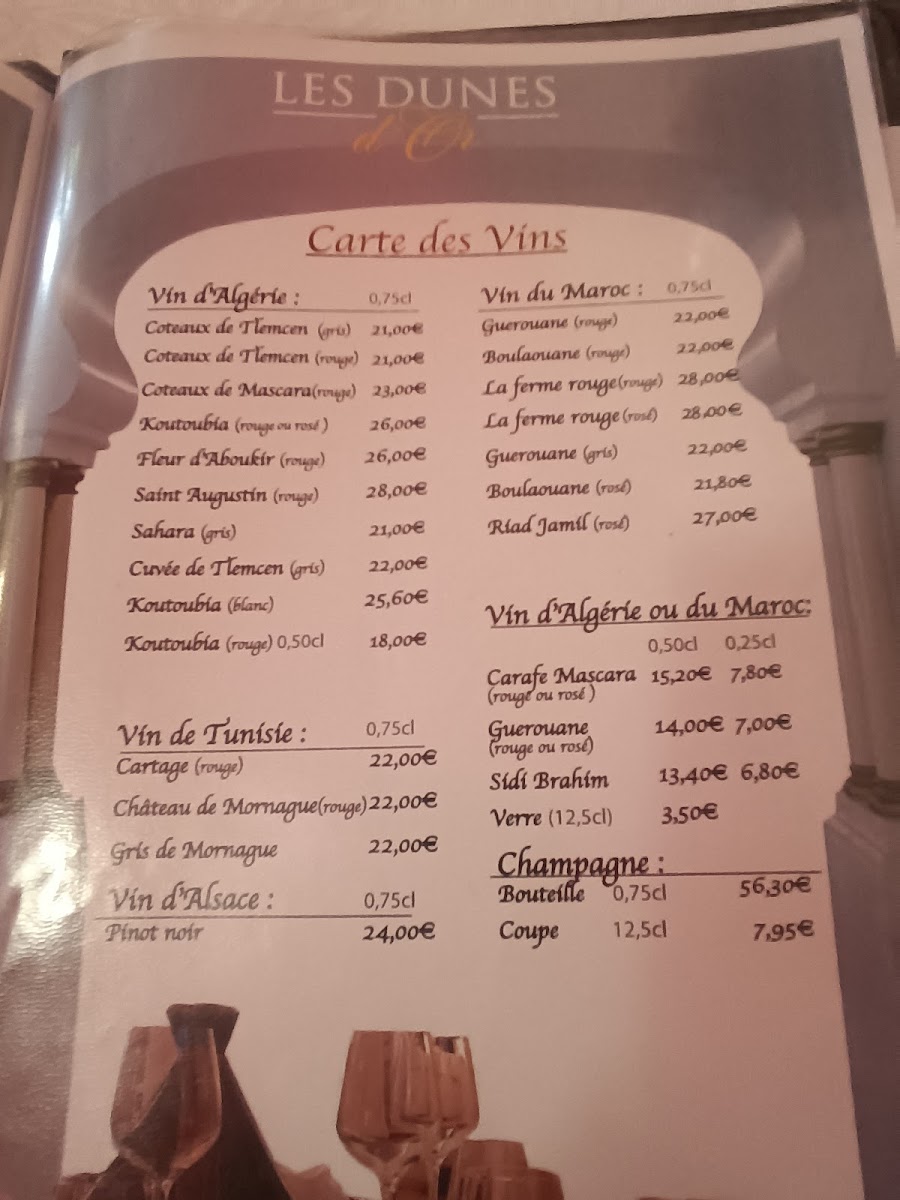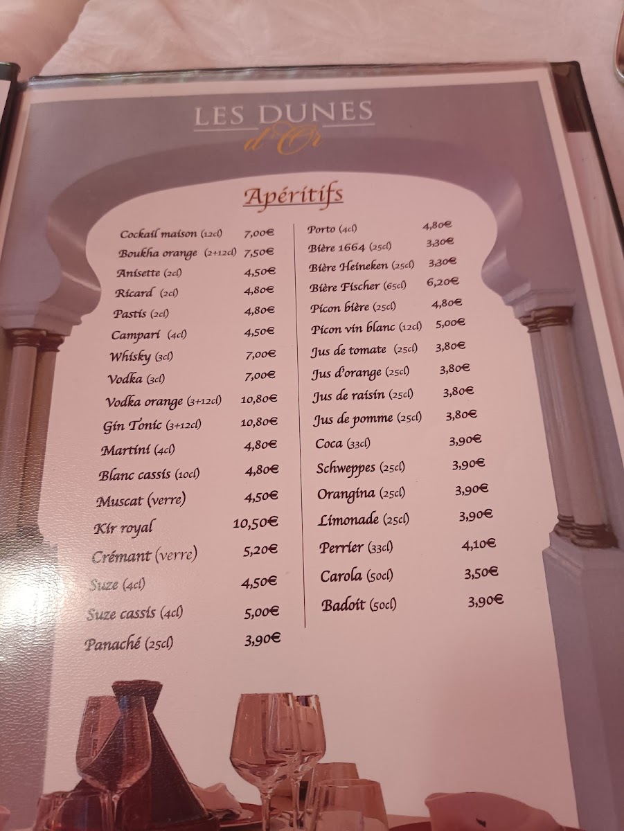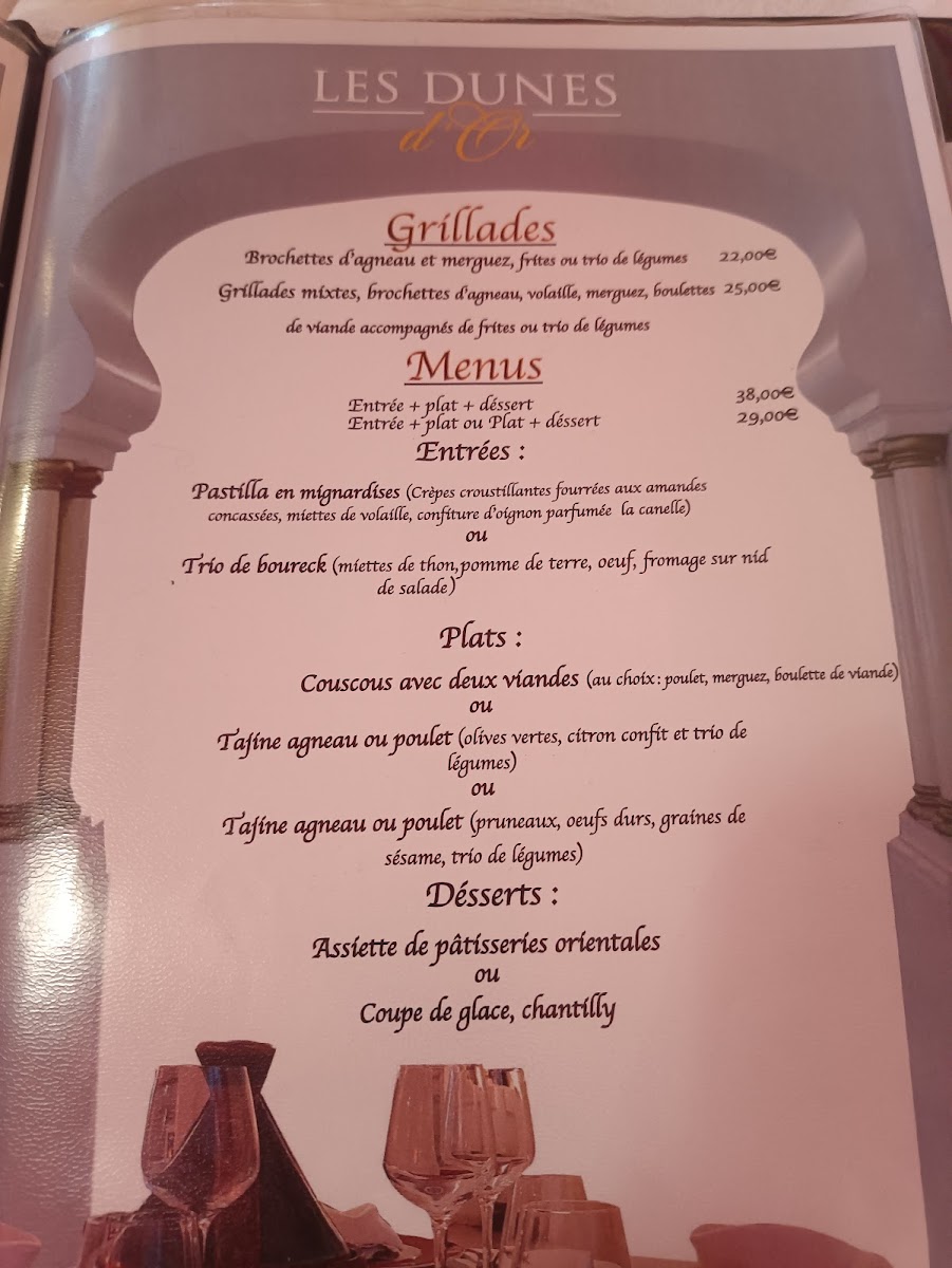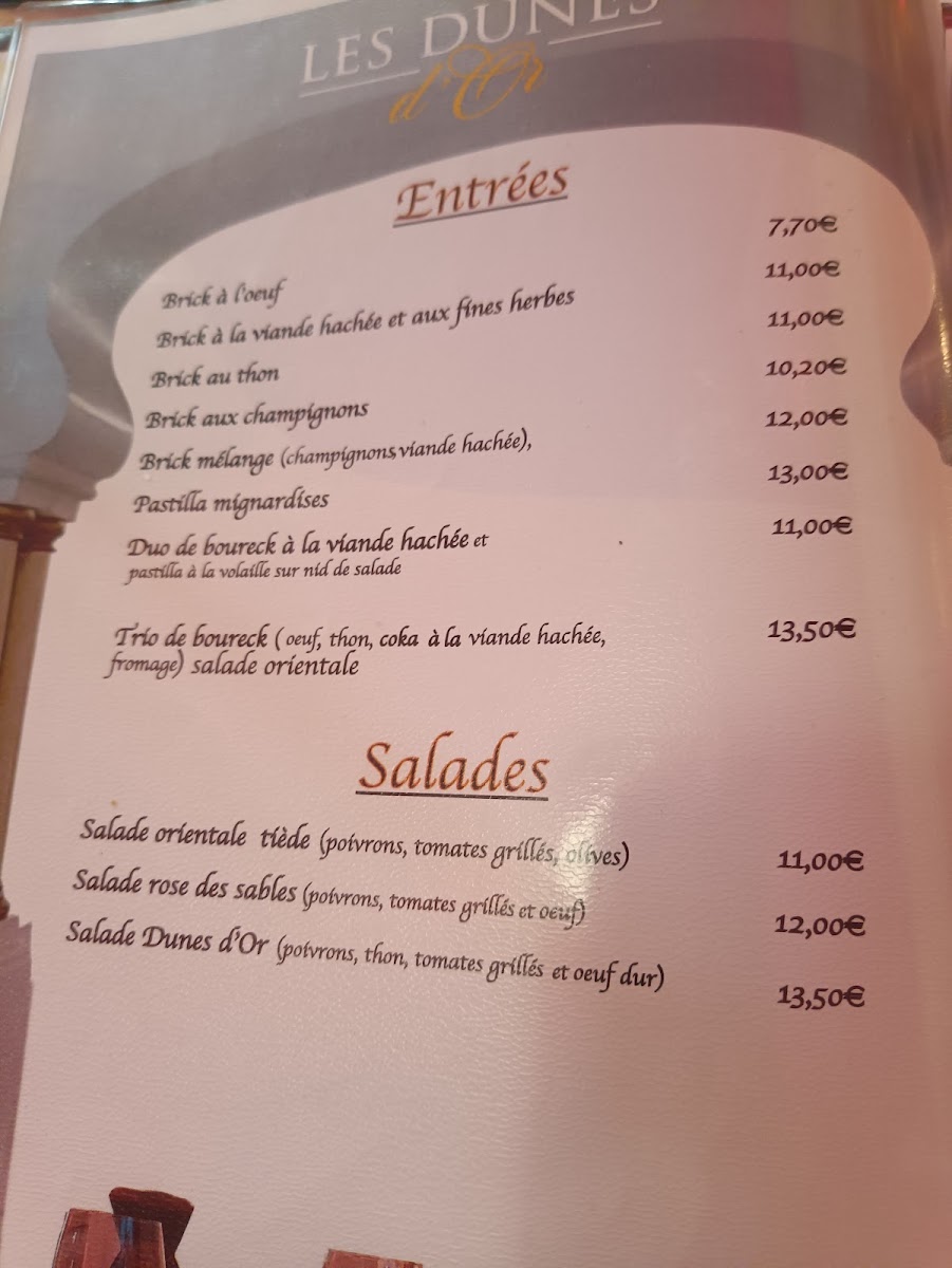 The menu at Les Dunes D'or in Strasbourg offers a delightful journey through Moroccan flavors, combining traditional dishes with a modern touch. One of the standout offerings is the Tajine de Poulet Aux Olives Et Citrons Confits, a succulent chicken tagine cooked with olives and preserved lemons, providing a perfect balance of tangy and savory flavors. The Brochette Poulet, a tender chicken skewer, is another must-try, offering a smoky, grilled taste that pairs beautifully with a variety of side dishes.
